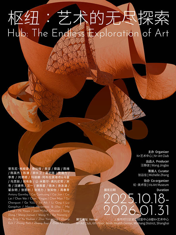 《枢纽:艺术的无尽探索》展览将于2025年10月18日至2026年1月31日在中国上海市闵行区诺亚财富中心6楼N+艺术中心展出,购票方式:前往大麦网搜“枢纽”即可购买。