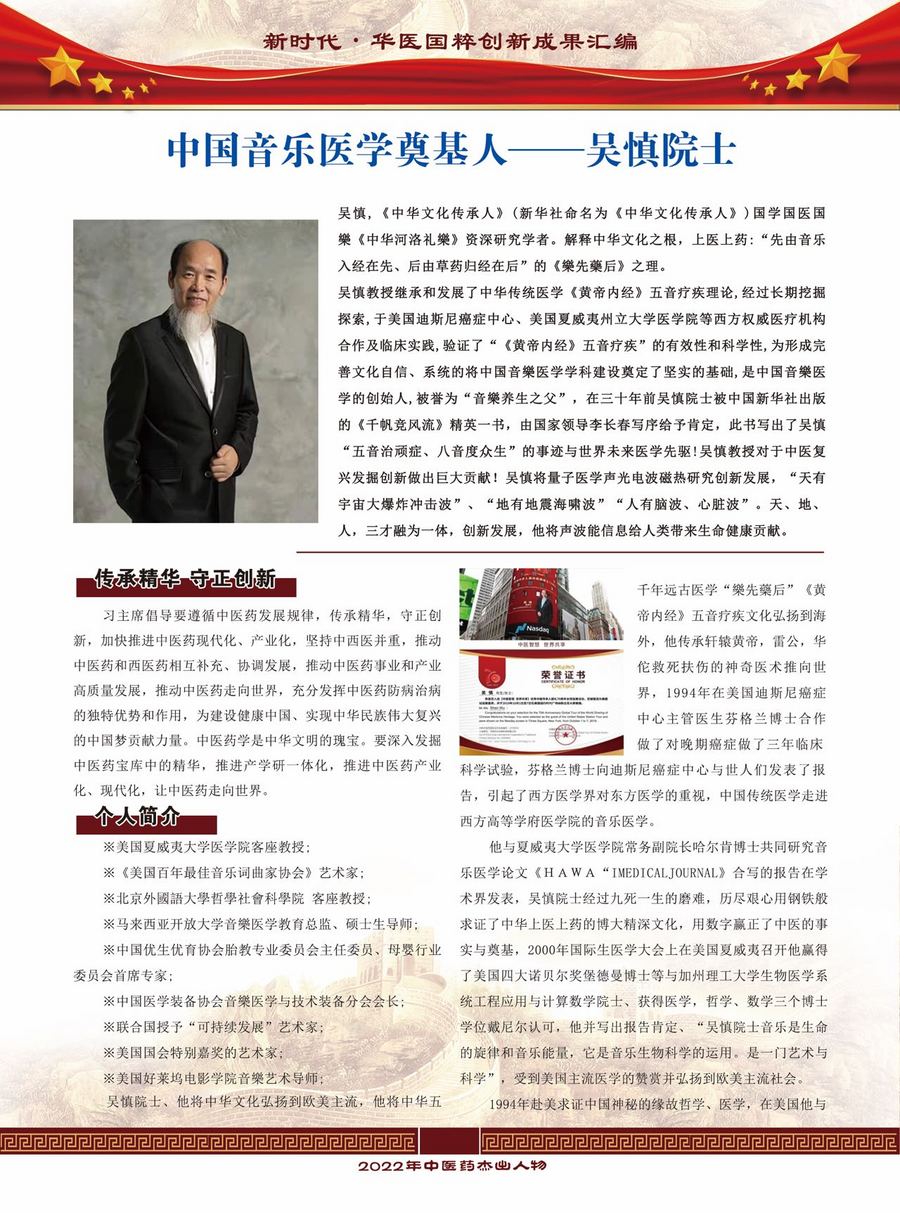 吴慎教授继承和发展了中华传统医学《黄帝内经》五音疗疾理论,经过长期挖掘探索,与美国迪斯尼癌症中心、美国夏威夷州立大学医学院等西方权威医疗机构合作及临床实践,验证了“《黄帝内经》五音疗疾”的有效性和科学性,形成完善文化自信、系统的将中国音樂医学学科建设奠定了坚实的基础,是中国音樂医学的创始人,被誉为“音樂养生之父”。三十年前中国新华社出版的《千帆竞风流》精英一书,由国家领导李长春写序给予吴慎院士肯定。此书写出了吴慎“五音治顽症、八音度众生”的事迹与世界未来医学先驱!吴慎教授对于中医复兴发掘创新做出巨大贡献!吴慎将量子医学声光电波磁热研究创新发展,“天有宇宙大爆炸冲击波”、“地有地震海啸波”“人有脑波、心脏波”。天、地、人,三才融为一体,创新发展,他将声波能信息给人类带来生命健康贡献。